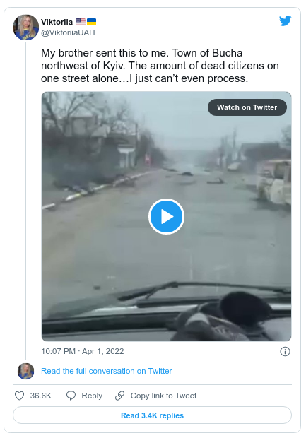 (2) Viktoriia 🇺🇸🇺🇦 on Twitter: “My brother sent this to me. Town of Bucha northwest of Kyiv. The amount of dead citizens on one street alone…I just can’t even process. https://t.co/KOSwISih6N” / Twitter ↩︎